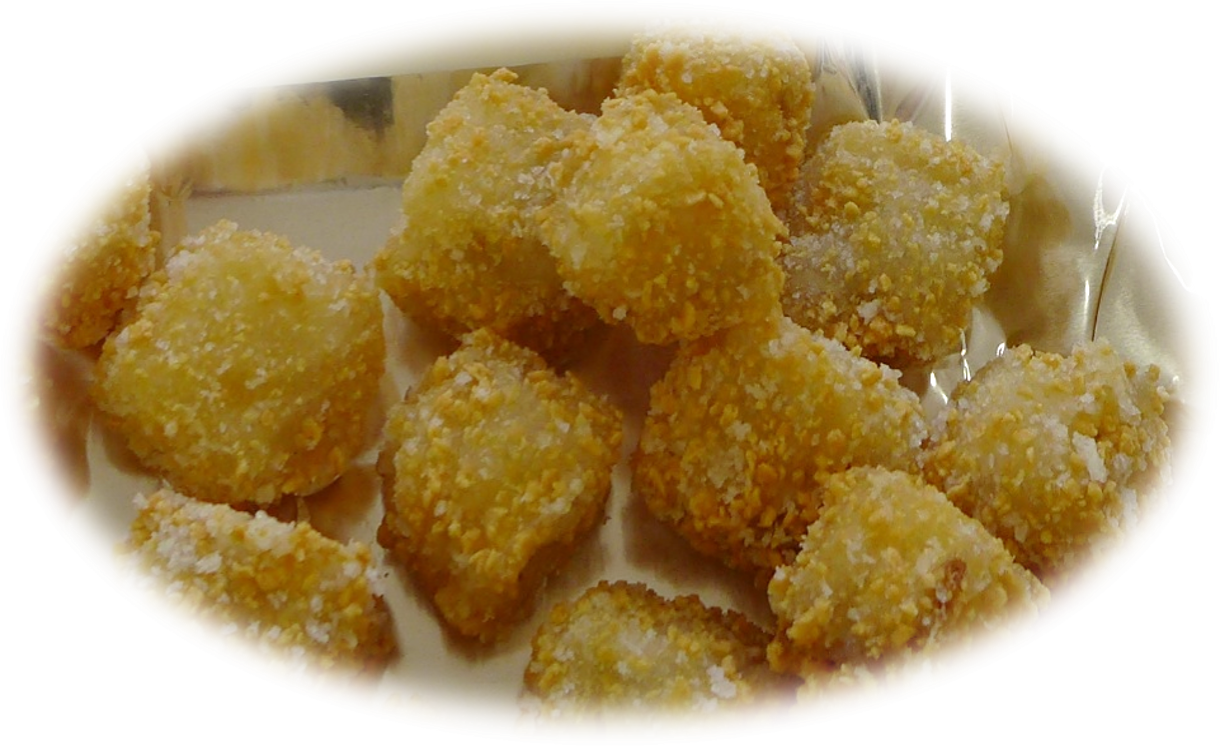 鮮度の良いスケソウ原料をダイスカットにして、じゃがいもを粒状にした衣をつけてプリフライにしました。